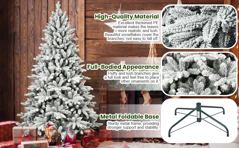 Made from high-quality, flame-retardant, and non-allergenic materials, our snow-flocked Christmas tree is built to last for many Christmases. The sturdy metal stand ensures stability, allowing you to enjoy a safe and worry-free holiday season with your loved ones.