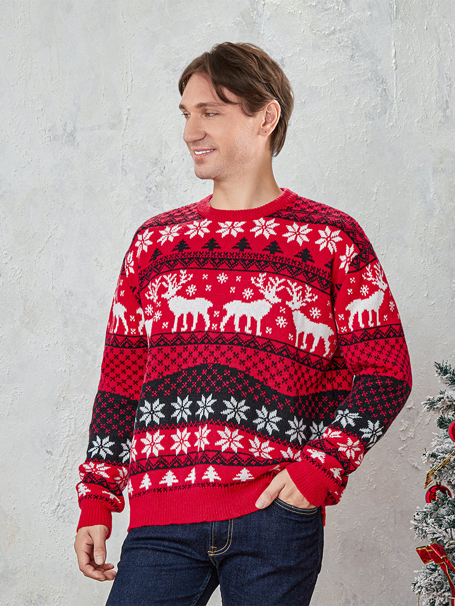 Unisex Christmas Sweater Winter Couple Long Sleeve Round Neck Reindeer Pattern Classic Fit Knit Tops