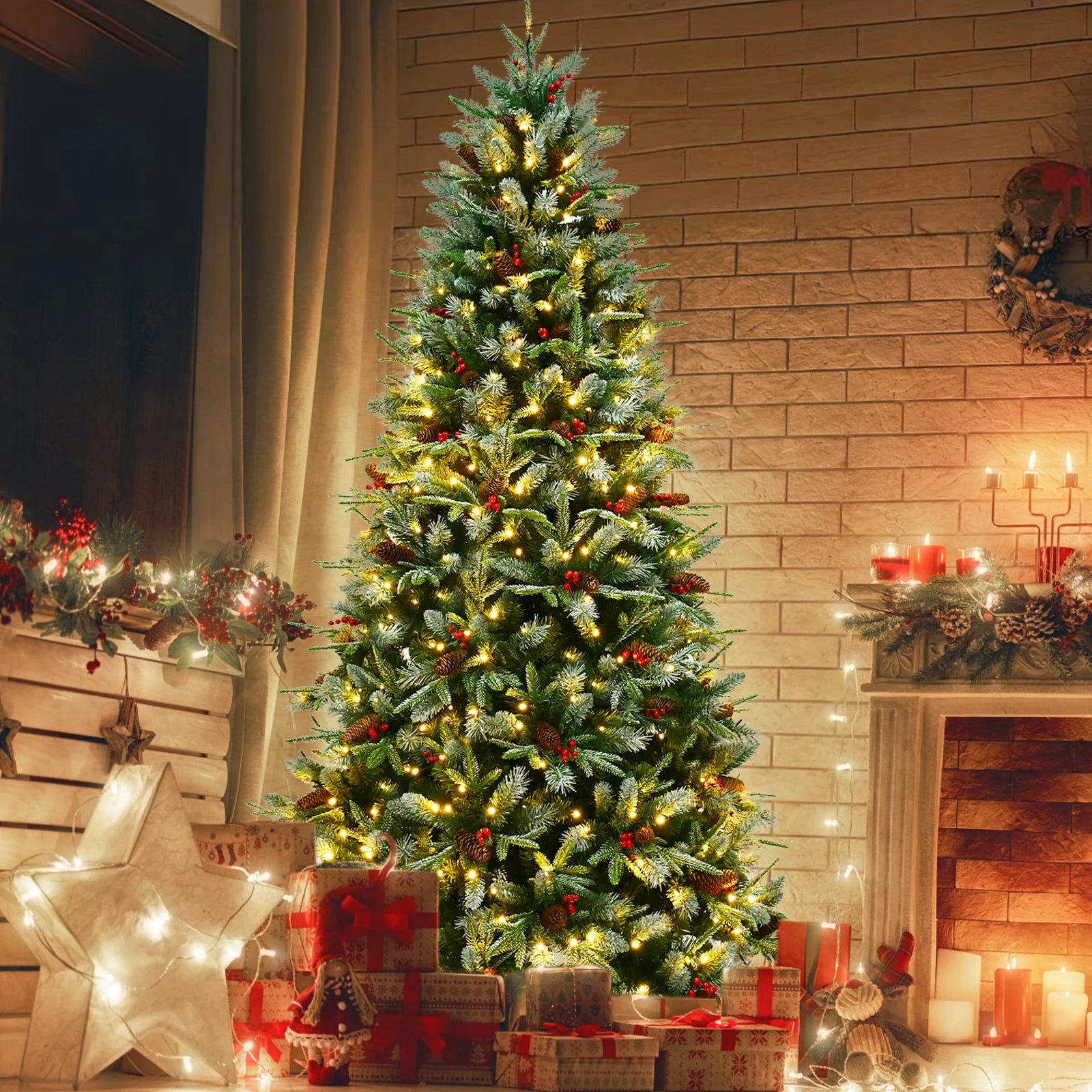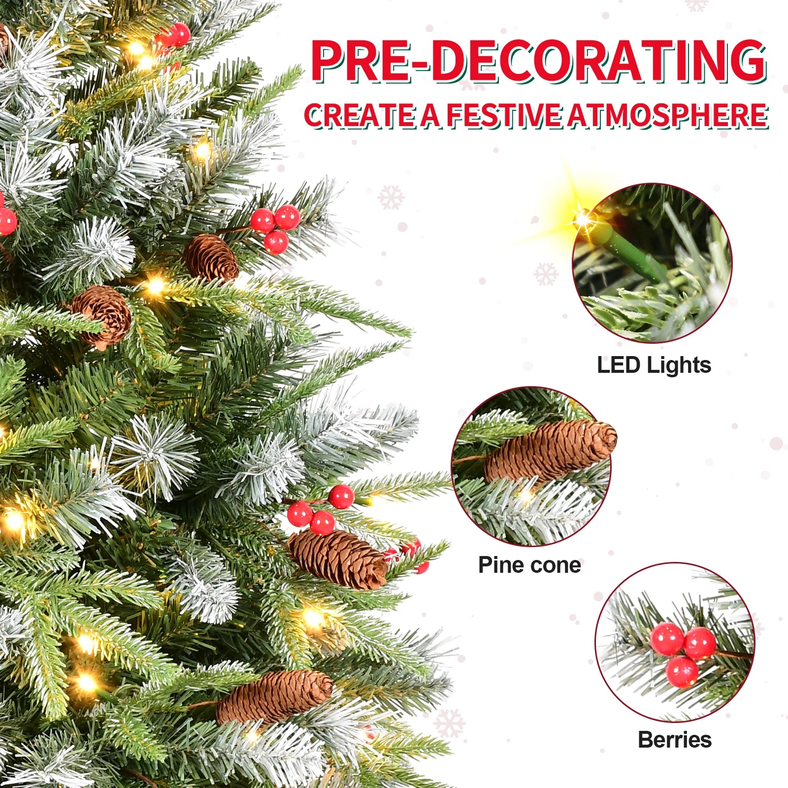 Pre-Lit Christmas Tree with Pinecone & Berries PE & PVC Mixed Branch Tips, Hinged Snow Frosted Artificial Xmas Tree