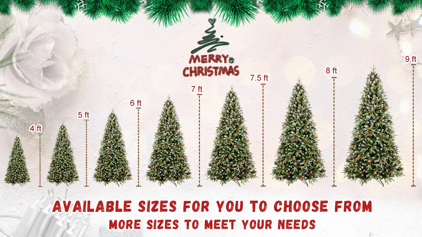 Lifelike and Natural Charm: This Christmas tree features a blend of PE and PVC branch tips, delivering a fuller, more realistic appearance. The snowflake-dusted branches mimic the look of frosted winter pine, adding a touch of festive magic to your holiday decor