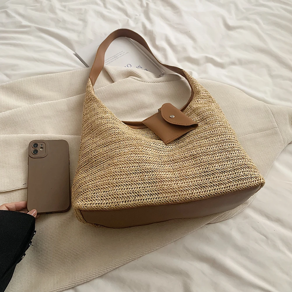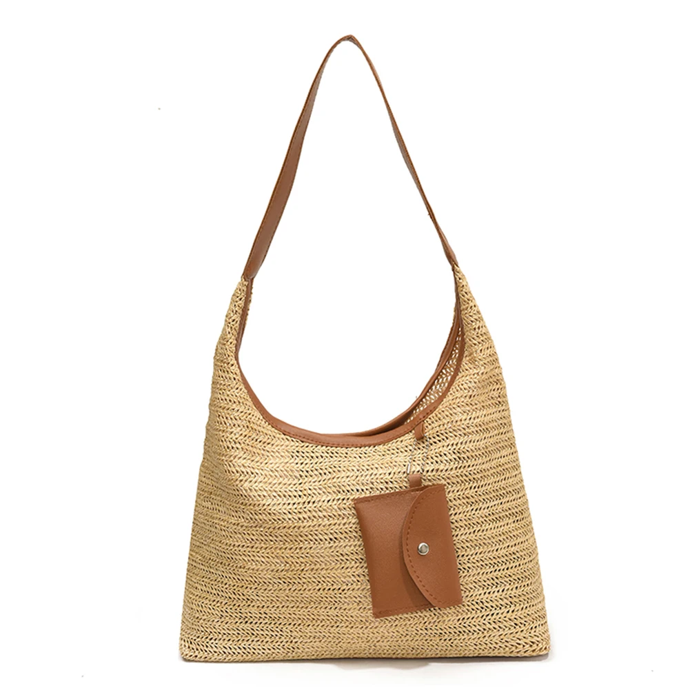 Women Stylish Knit Shoulder Bag Wear Resist Straw Tote Bag Large Capacity Hand Woven Shoulder Bag Commute Bag with Purse